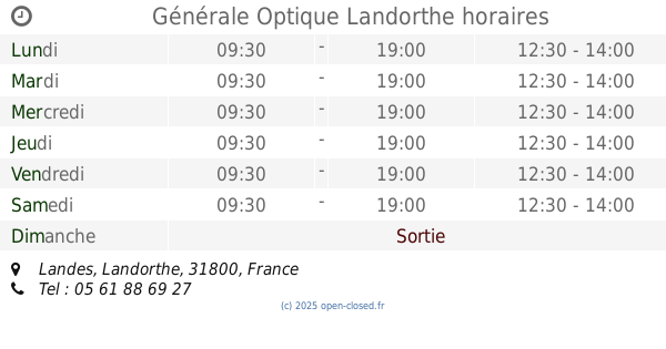 Add it to your website, your phone or even your desktop - opening times, phone numbers and the road to Store of the Générale Optique Dans Landorthe, Landes.
